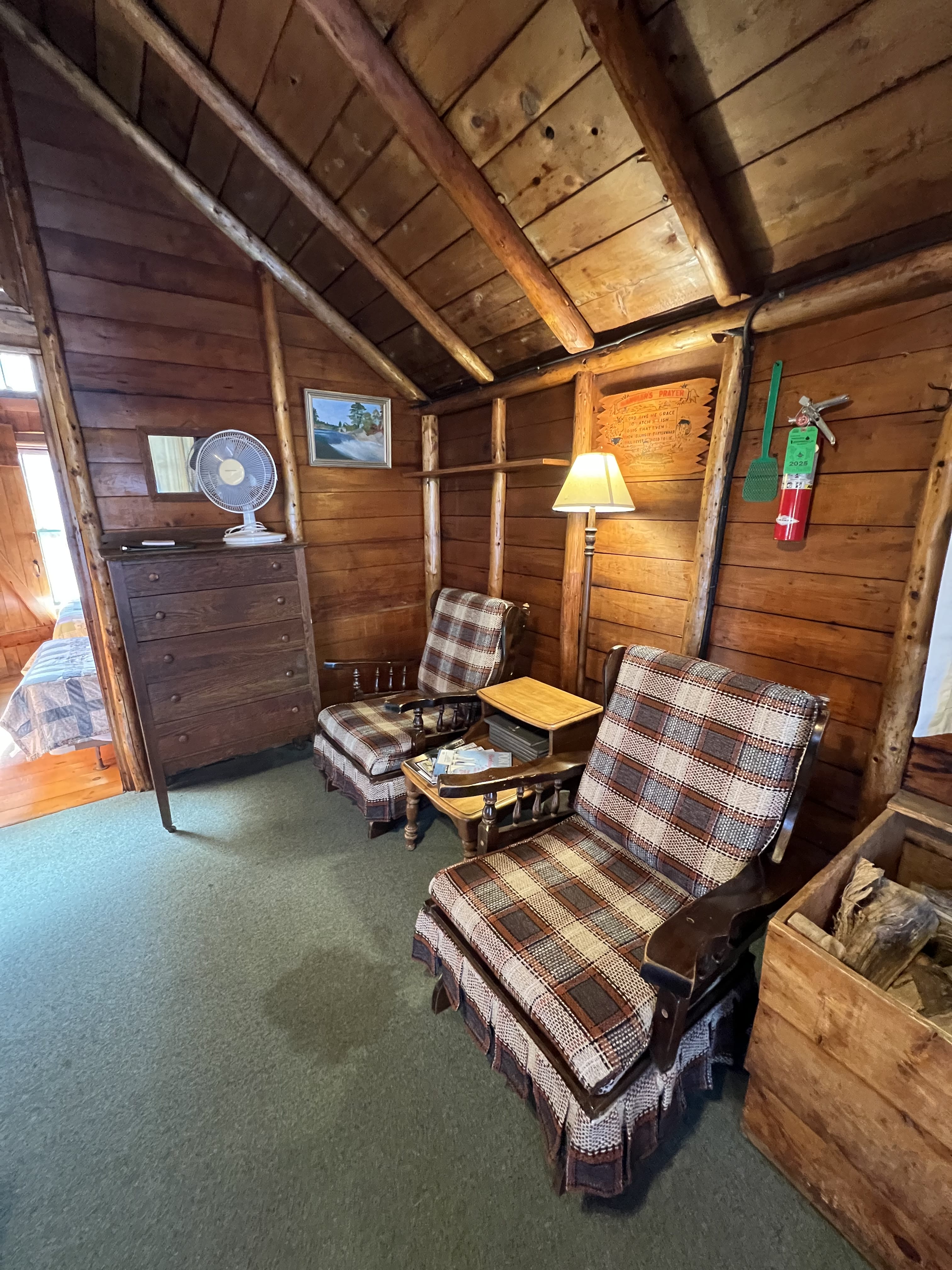The inviting living room area includes a couch and two chairs – ideal for relaxing after a day on the water. A wood stove adds warmth and charm to the space and comes fully stocked with firewood, kindling, and newspaper so you can unwind by the fire in classic Maine camp style.