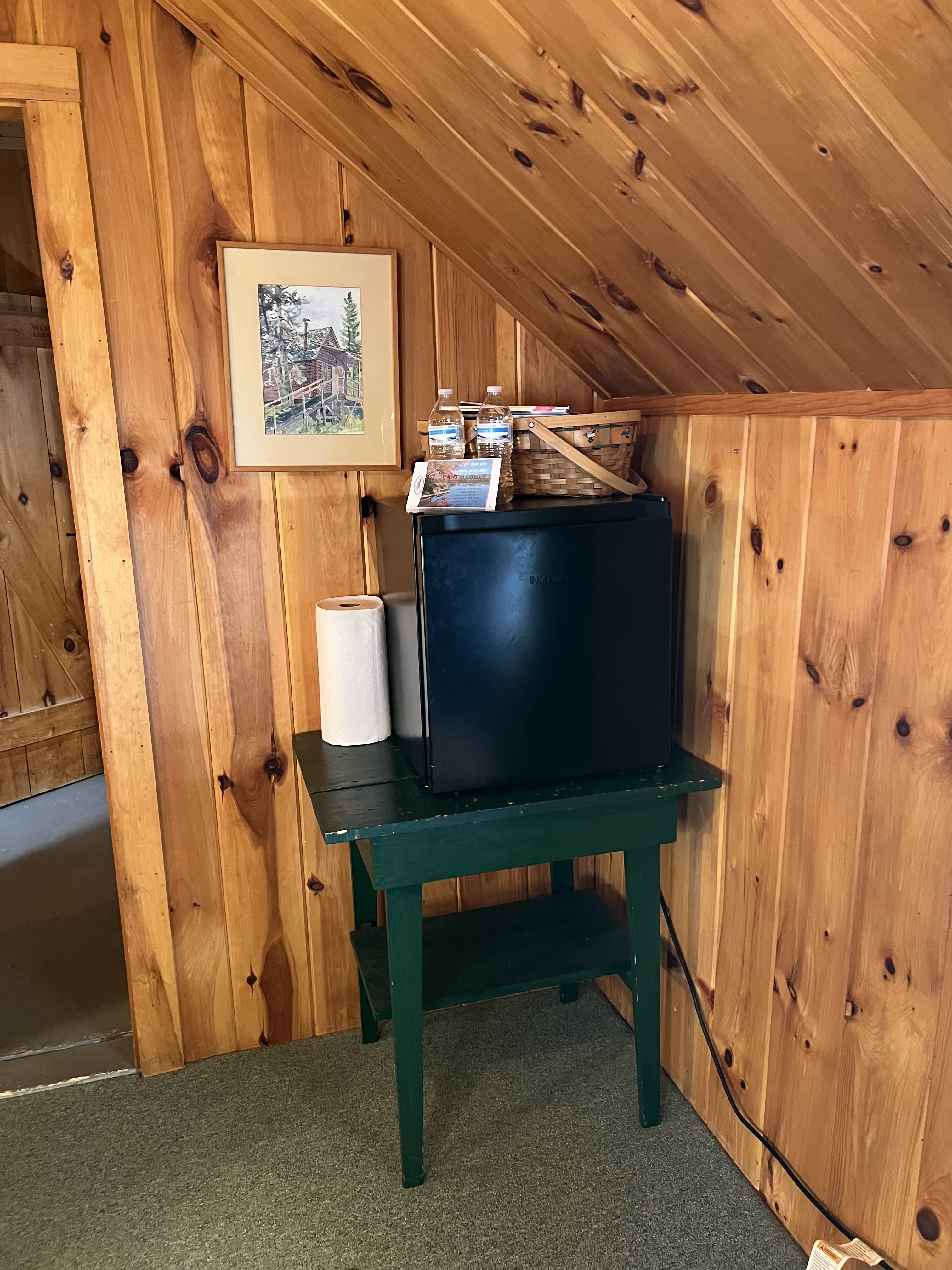 The living area is equipped with two wooden rocking chairs, a mini fridge, and a wood stove to keep the cabin warm and inviting on cooler days. We keep the cabin stocked with plenty of firewood and newspaper, so you’ll always be ready to get the fire going.