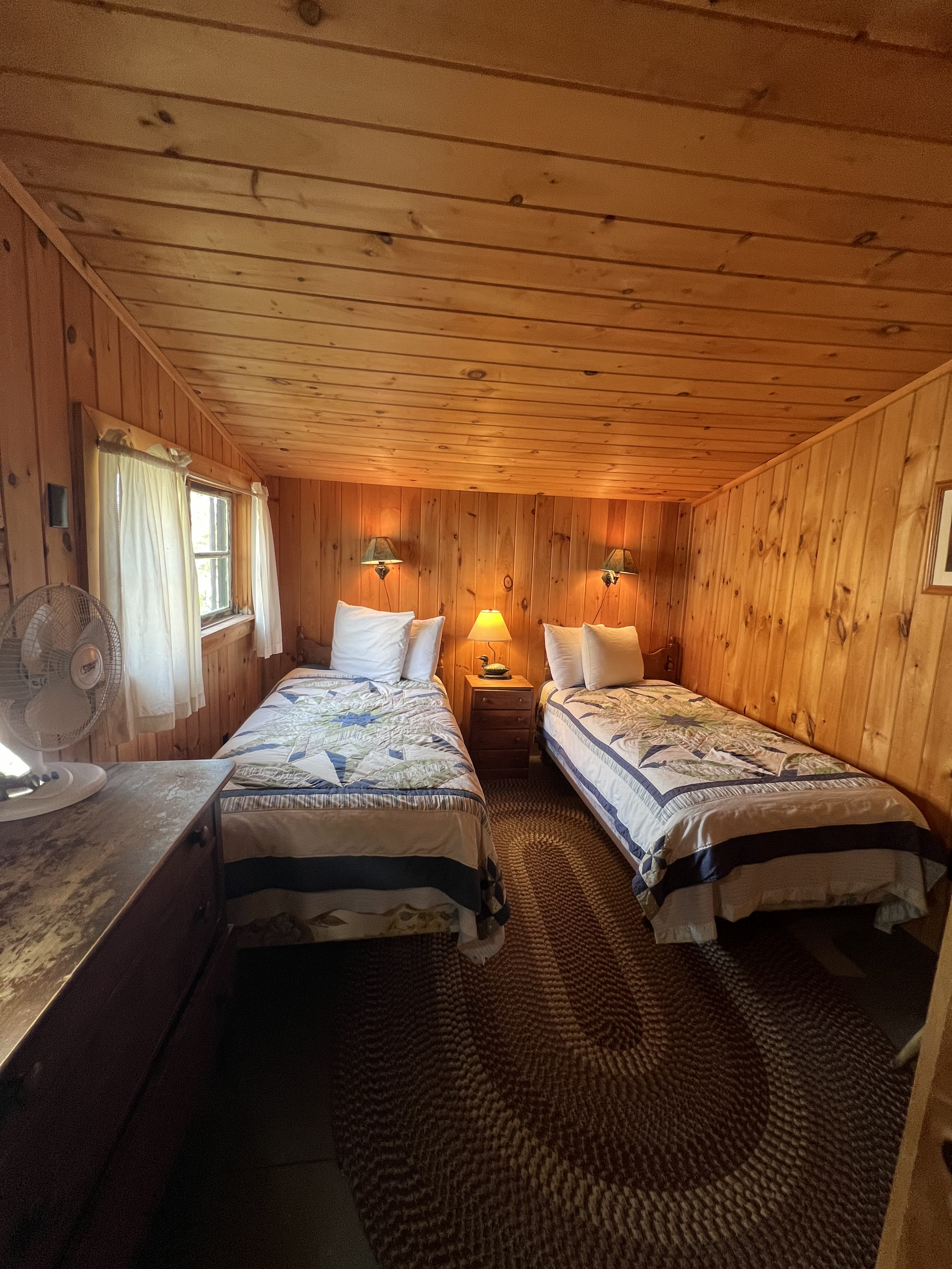 This traditional log-style cabin features one bedroom with two twin beds, offering a comfortable and quiet place to rest after a day of exploring the outdoors or relaxing by the lake.