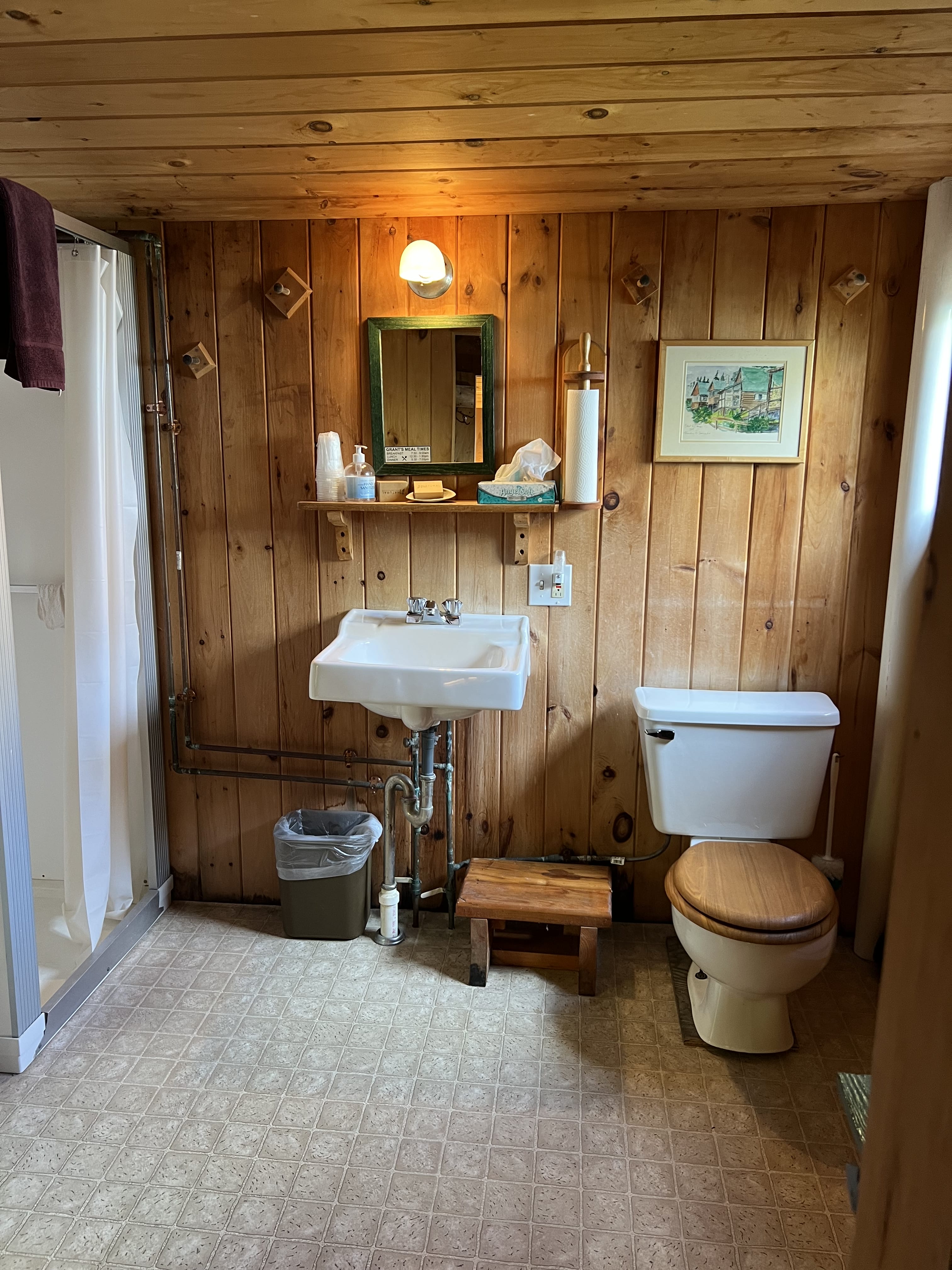 The bathroom includes a 30″ shower, toilet, sink, and mirror, and is fully stocked with plush towels and paper products for your comfort and convenience.