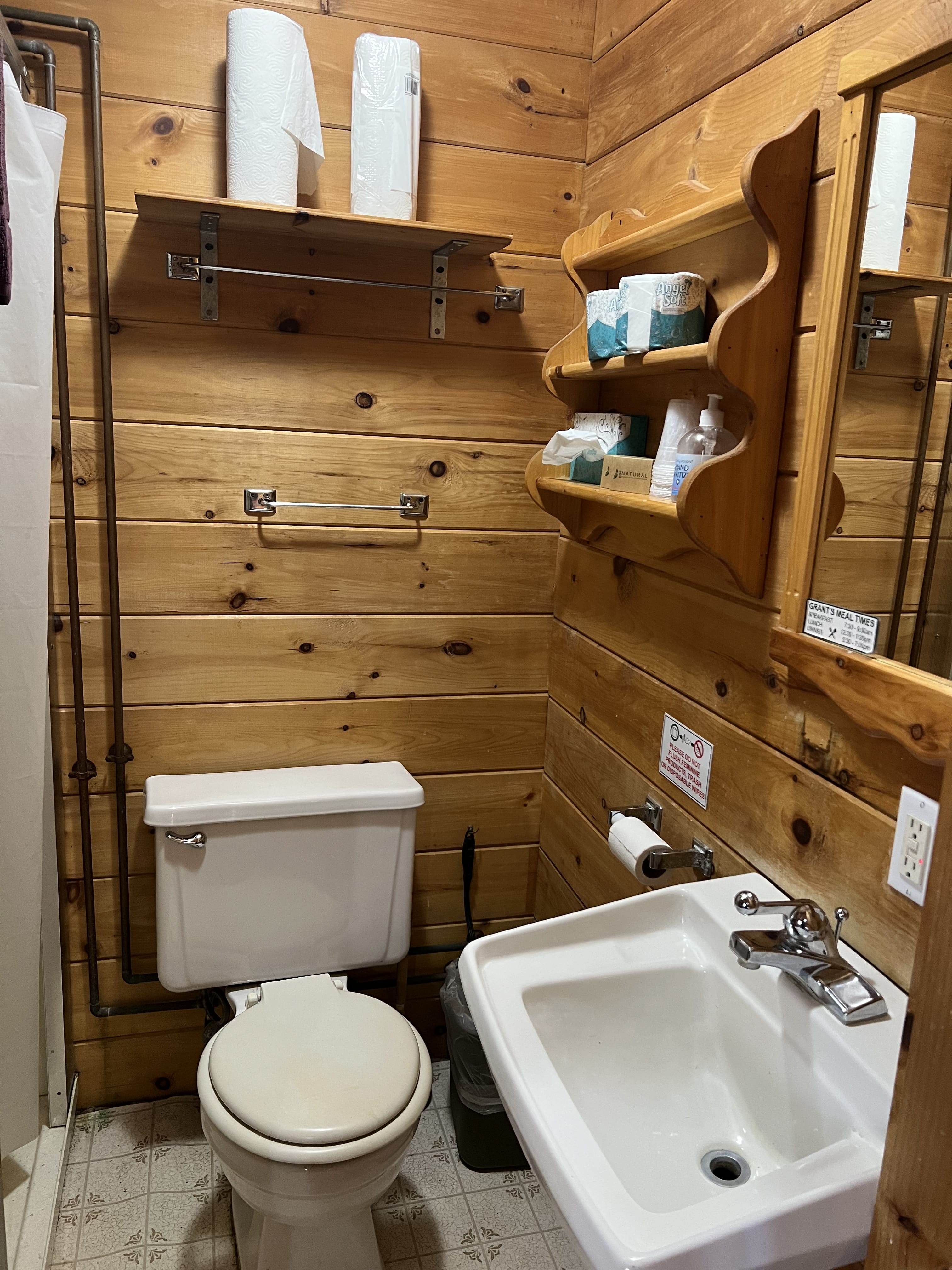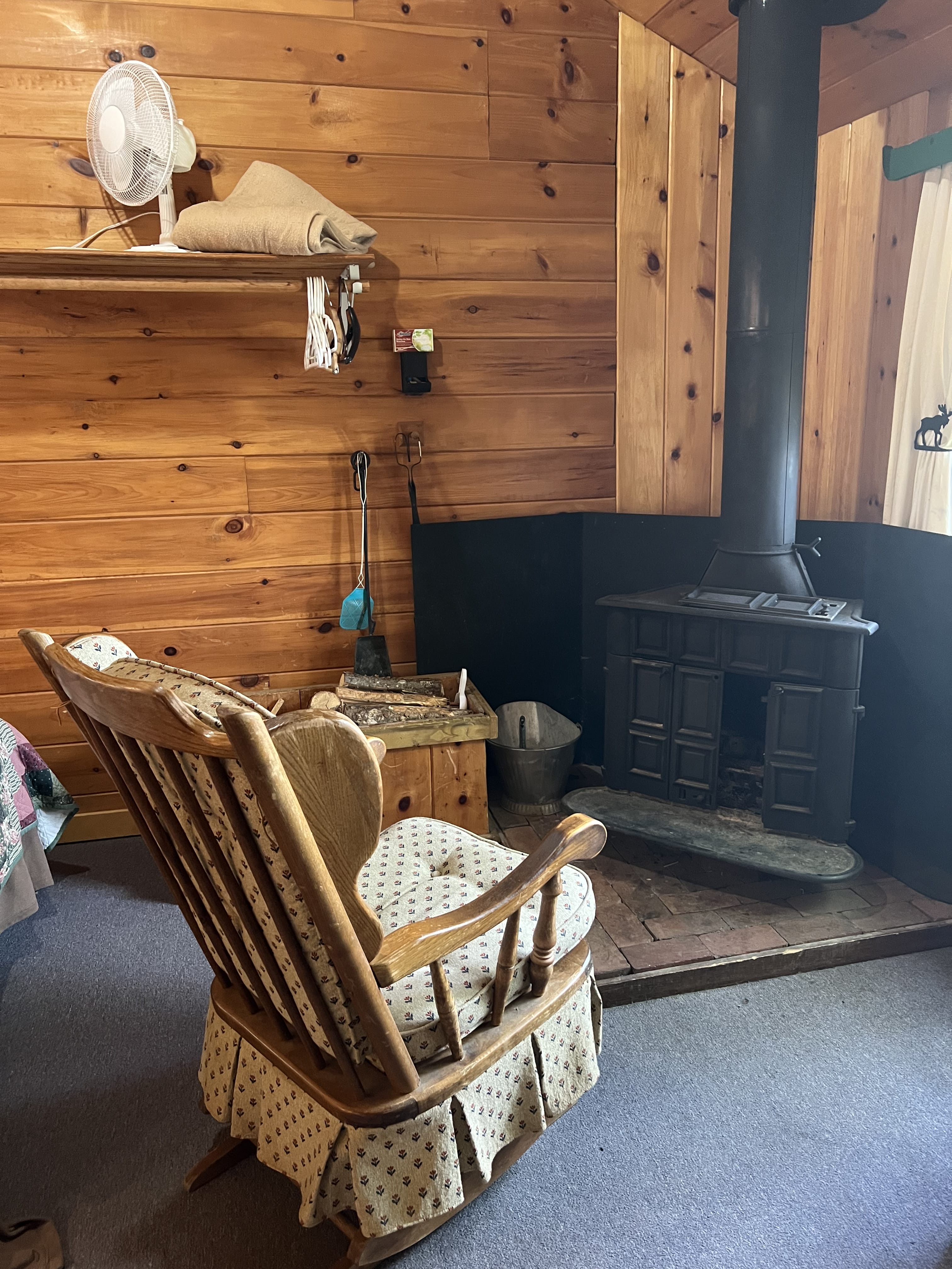 Inside, Cabin Skeet features one double bed and one twin bed in a spacious, open layout. The living room area includes a comfortable rocker chair and a game table – great for board games, trip planning, or recounting the day’s adventures. A cozy fireplace keeps the space warm and welcoming, and is stocked with firewood, kindling, and newspaper for easy use.