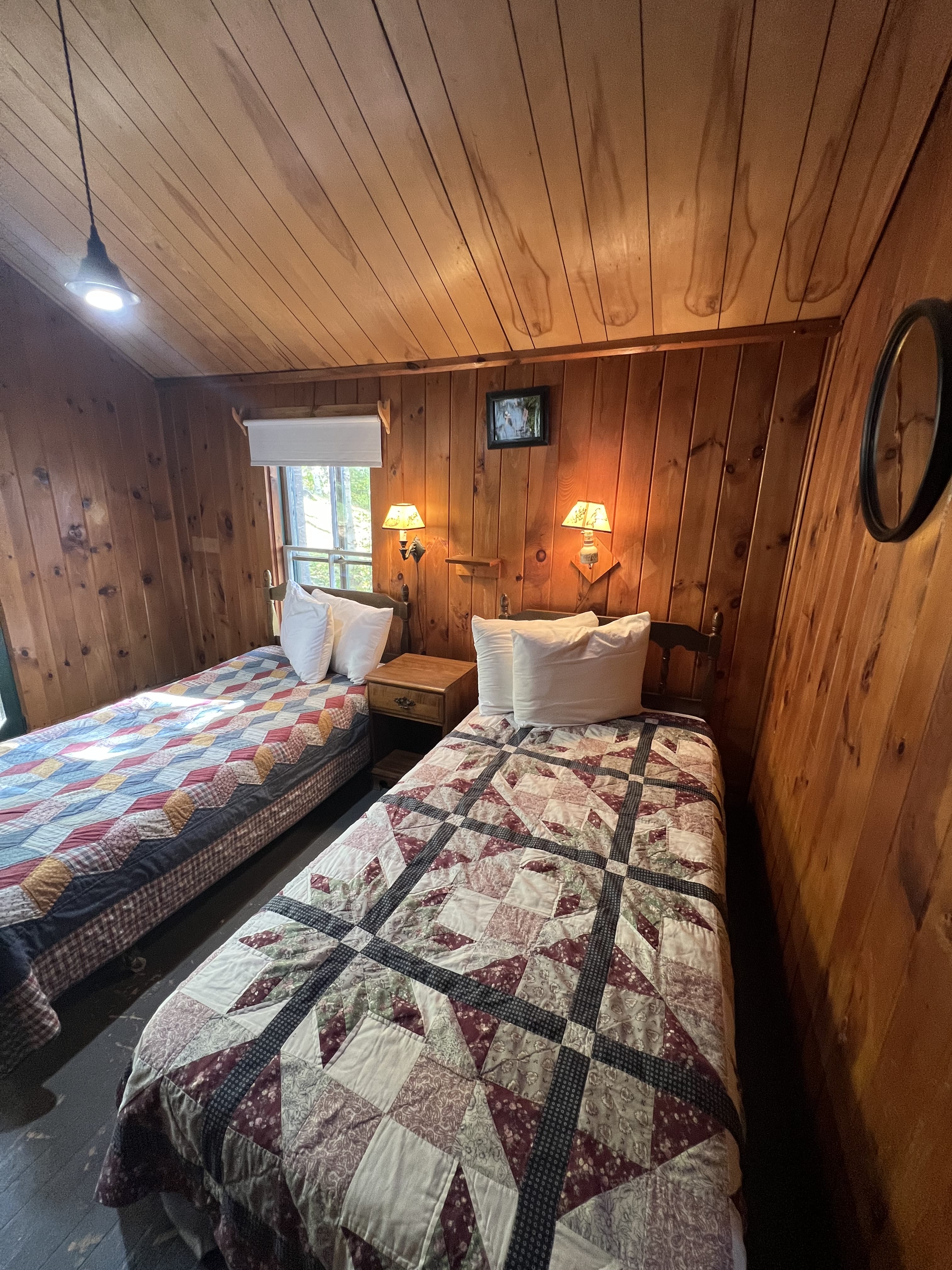 This cabin features one bedroom with two twin beds, ideal for a comfortable nights rest after a day outdoors.