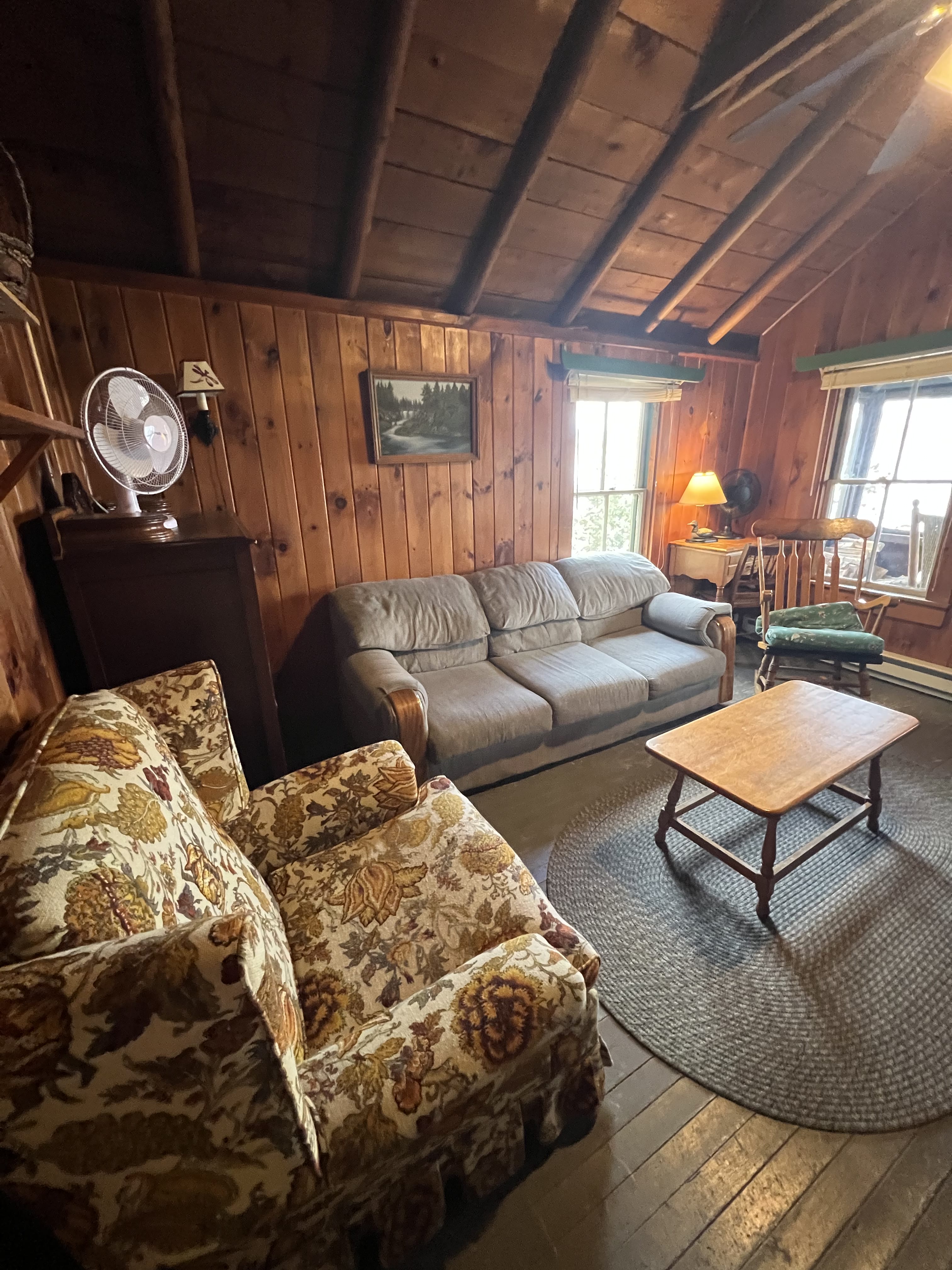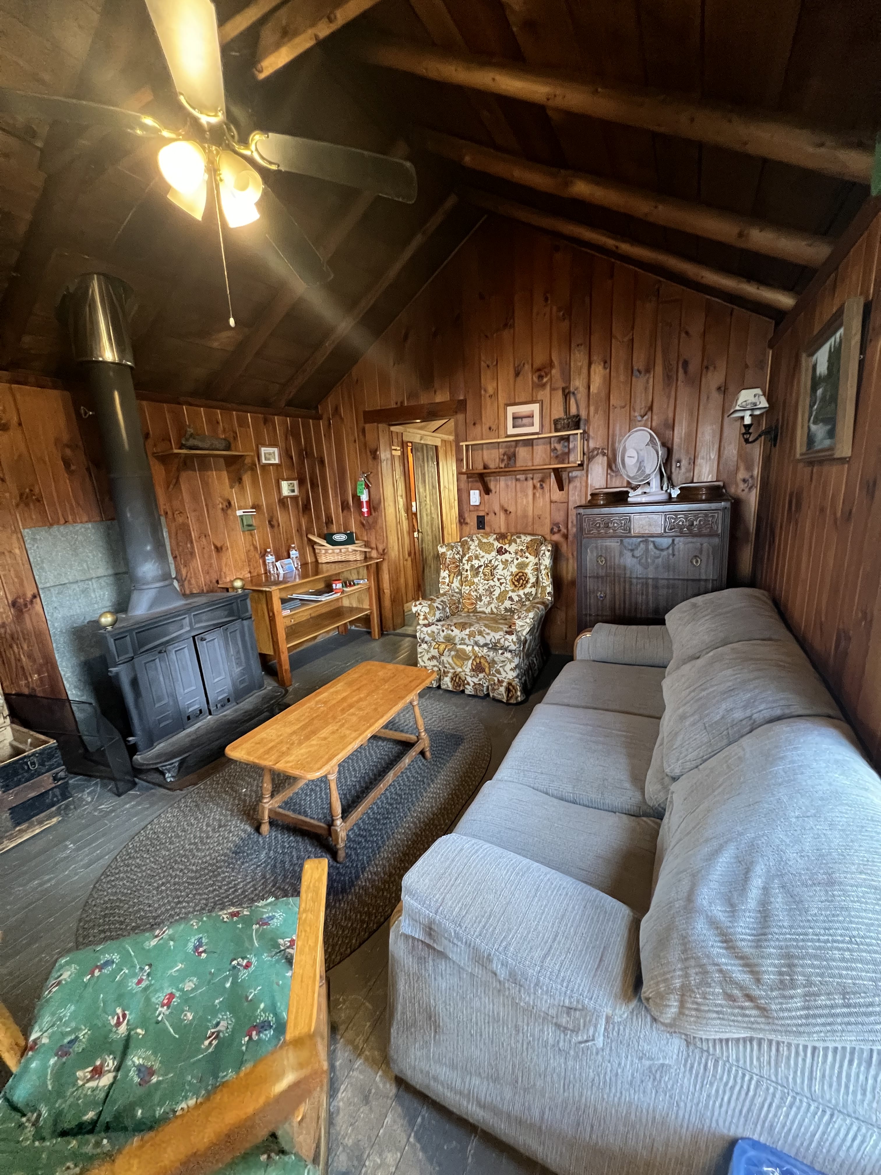 The living area offers a warm and inviting space with a wood stove, cozy couch, chair and. arocking chair, making it the perfect spot to relax after a day in the field. We provide firewood and newspaper, so you can keep the fire going throughout your stay.